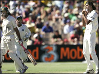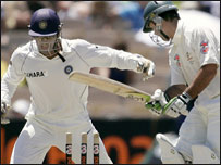उनके चोटिल होने से पाँच गेंदबाज़ों के साथ उतरने की भारत की रणनीति को झटका लगा. लंच तक भारत को कोई सफ़लता नहीं मिली लेकिन उसके ठीक बाद अनिल कुंबले ने फिल जैक्स को बोल्ड कर दिया. जैक्स ने हेडन के साथ 150 रनों से ज़्यादा की सलामी साझीदारी की और 60 रन बनाए. लेकिन मैथ्यू हेडन एक छोर से आक्रामक बल्लेबाज़ी करते रहे और उन्होंने टेस्ट करियर का तीसवाँ शतक पूरा किया. उन्हें ईशांत शर्मा ने क्लीन बोल्ड किया. माइक हसी को 22 के निजी स्कोर पर इरफ़ान पठान ने क्लीन बोल्ड किया. |