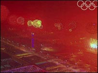 बीजिंग के आसमान में शानदार आतिशबाज़ी के ज़रिए चीन ने मानो ये याद दिलाने की कोशिश की कि बारूद उसी की देन है. यही नहीं चीन की दीवार, छपाई कला, रेशम कारोबार से लेकर उन सबकी झलकियाँ देखने को मिलीं जो दुनिया को चीन की देन हैं. लगभग दस हज़ार कलाकार समारोह की शाम को रंगीन बनाने में जुटे. ऐतिहासिक क्षण चीन के राष्ट्रपति हू चिंताओ ने ओलंपिक समारोह शुरु होने पर कहा, "जिस ऐतिहासिक क्षण का हमें इंतज़ार था, वो आ गया." ओलंपिक समारोह को देखते हुए कड़ी सुरक्षा व्यवस्था की गई थी और बीजिंग के मुख्य हवाई अड्डे को बंद कर दिया गया था. 24 अगस्त तक चलने वाले ओलंपिक में भाग लेने के लिए दुनिया भर के 11 हज़ार खिलाड़ी बीजिंग में एकत्रित हुए हैं. वे 302 खेलों में हिस्सा लेकर एक हज़ार मैडल जीतने के लिए खेलेंगे. माना जा रहा है कि 1980 के दशक की शुरुआत में जब खेलों का बहिष्कार हुआ था, उसके बाद से यह पहला आयोजन है जिसका इतना राजनीतिकरण हुआ है.