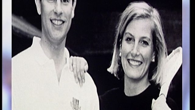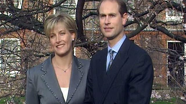 Prince Edward announces his engagement to Sophie Rhys-Jones and their plans for a family wedding at Windsor.