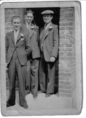This is a photograph of my father, Robert Beesley, with two of his friends, Jimmy Ashley and Reg Danerhue. It was taken at my home at West Road,Mortlake in Surrey at my sister's wedding in August 1939,before the Second World War.