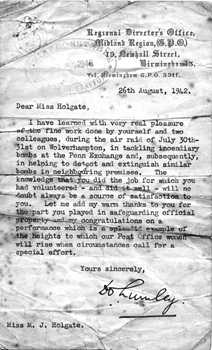 At this time he was a Chief Inspector with Wolverhampton Police Force. He heard that the Chief Constable had enrolled his daughter Ida as a GPO telephonist; a reserved occupation due to communications being of primary importance. Before I could say 'number please', I found that I too was sitting at a switchboard amongst dozens of other girls. We sat there for hours like a lot of battery hens. When the enemy bombers crossed the coast they were tracked and when they were reaching a specific area a 'Red Alert' was notified. The telephone exchange notified all the relevant authorities and the air raid sirens sounded, telling the population to take cover in the air raid shelters.