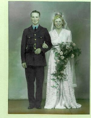 The wedding picture is of Joyce and Fred Butterworth. Fred was an RAf mechanic during the war. He was on a newsreel during the conflict and wrote to his wife that he would be on the news. She went to the pictures all week until she saw him.