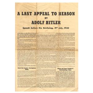 "In this hour I feel it to be my duty before my own conscience to appeal once more to reason and common sense, in Great Britain as much as elsewhere. I consider myself in a position to make this appeal since I am not the vanquished begging favours, but the victor speaking in the name of reason. I can see no reason why this war must go on.