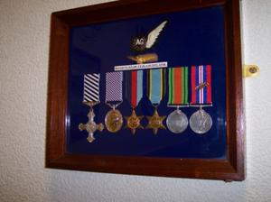 The medals of Squadron Leader Jack Blair DFC DFM. They are displayed on the wall at Royal British Legion at Egremont, Cumbria. [Photograph by Joseph Ritson]