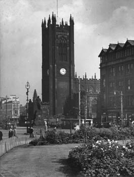 West end of Manchester Cathedral, 1950s, with air raid shelter.