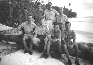 Mr. George Thompson, seated 1st left on the beach of Cocos Keeling Island, 1945.