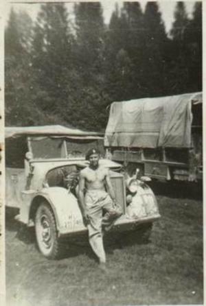 On returning back to Ferndorf we pulled up stakes and moved on to Trieben. Here by comparison with the POW cage, we had a cushy job and were able to take it easy. The village was positioned at the bottom of a mountain pass and the squadron's task was to set up road blocks to catch escaping vehicles, and at the same time to set up a traffic system that allowed vehicles to travel only one way at a time through the narrow road.