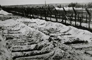 This photograph shows some of the graves that had to be dug for those that died. 10,000 unburied dead were found at this camp, another 13,000 died shortly after.