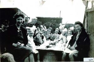 The adults are (L-R) Margaret Nelmes and Joyce Sturman. The children are (L-R) Hilary Wignell, Mary Hunt, Ezra Bend, Sylvia Bend, Barbara Storey, Ronnie Bend, Ettie Newton, Lillian Newton, Dennis Headworth and Carol Fletcher.