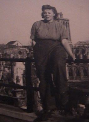 Our destination was a battered Cinema in the town of Caen, which was almost flattened. Our billet was the projection room so twelve girls slept in there. The kitchen range, which was downstairs, was fuelled by old oil. I had never cooked like this before and the oil had a habit of overheating. One day something went wrong and the whole range went up in flames. I screamed and lads next door rushed in and fought the flames. Later the Commanding Officer for the whole of the area, came in and said