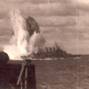 His son John says: T"his is an American destroyer you can see in the foreground and it’s taken a picture of HMS Kent and there’s a shell exploding just off the port stern there.