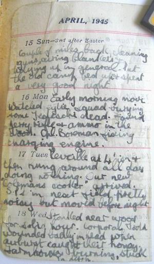 The entry in my diary is fairly innocuous. Checking back using Regimental Diaries I can see that we were with the 2nd Armoured Brigade column in the Reno bridgehead area and that I had been with the 4th Hussars for about three weeks.