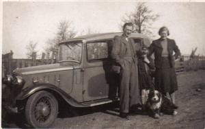 The Austin 10 that we slept in. Notice Rover, the farm dog. Notice too the blackout hoods over the headlights