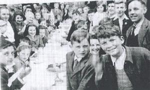 Pictures taken at the back of Rosary Road and St. Thomas Road in Erdington (Nr Slade Road School) in those days Birmingham 23. It is the V.E. Celebration at the end of the second world war in May 1945 where all the parents gave whatever food they could and managed to give a party to the children of the area. I myself was at work during the day the photos were taken (I was nearly 15 years old) but I was told it was a great occasion. On No 2 Photograph my brother — Keith Woodward is on the extreme right hand bottom of the picture (12 years of age then) and Bobby Hilstead standing behind him. His mother (Mrs Hilstead is to the right of my brother). The daddy holding the baby girl is Mrs. Rushton (our next door neighbour) who lived at No. 7 St. Thomas road and her son John is the lad who has got his mouth open and his hand on the table.