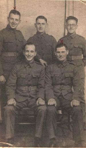 Back Row (L-R) Johnny Johnson (RPs), Jack Smith (Signals), Frank Crockford (Driver) and Front Row (L-R) Ron Harwood (Signals), Lewis Edwards (Signals) photographed at the Whitbread Hop Farm, Paddock Wood, Kent between September 1939 - May 1940; 'B' Company, 1st Bn QVR