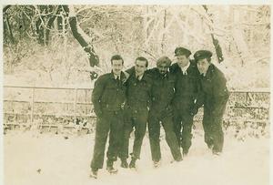 Flying Officer Jaak Vanderperren (r.) during the winter of 1944 with fellow pilots.(Location unknown)