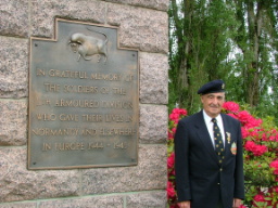 4 June 2004. Pat Kelly, at the 11th Armoured Division Memorial, Flers, Normandy. The Memorial was unveiled by the Division's CO, Major General 'Pip' Roberts in 1974. The sculpture displays the Division's insignia of 'The Black Bull'. The Division charged from Normandy to the Baltic.