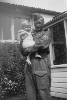 Another sergeant was Andrew, a brother of Jim MAY. A notebook from around this period exists which lists a number of names, including LEA WILSON, A. RISBRIDGER, D. EMERY, A.S. and J. BUTLER, HODGSON and CHURCHILL. A lot of the details involve range practice, wearing armbands and in one case the Beech Section being on duty at the Waterworks OP, unfortunately although there are a couple of vague dates there is nothing to indicate the month or year. Apart from one photograph, which shows him in uniform wearing sergeants stripes and holding me, very little information survives from this period and all that I can remember is seeing him in uniform on odd occasions