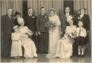 Left to right, Joseph and lily Ball, (parents), Freda Inwood and Betty Ball (bridesmaids), Peter Bullock (best man) Ivor and Una Ball, Hubert and Lucy Palmer (parents) Edna Palmer (bridesmaid) and Jeffrey Palmer (pageboy)