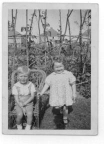 Peter with cousin Anne in July 1944. Italian Prisoner of War Camp in background behind the runner beans. Ash near Aldershot.