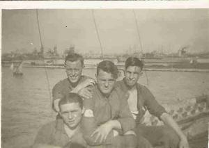 Me (right) and some friends on HMS Illustrious in the Med during World War Two.