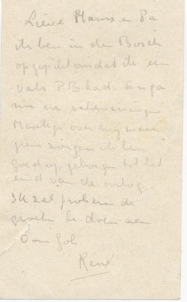 From the other letters that I found you can easily draw the conclusion that many people expected the war to be over soon at that time, early 1944. His brother, my father, was kept a Prisoner Of War at that time, kept somewhere in Poland near the Russian border I believe Stanislaw or Langewasser. They were permitted to write their families and I found many letters that were written to or from the POW-camp. In one of the early letters, my uncle René also writes a few lines. He says that the German occupier wants them (the Dutch students at the universities) to sign a declaration of loyalty to the occupier. He says that the professors urged them not to sign the declaration. He says practically 99% of the students in Tilburg didn't sign ! He awaits further measurements of the occupier and expects that it will end finally like it ended with him [my father] 'I guess we'll have to go through this like you ! But we cannot know what it is bringing us before we have the experience ourselves !'