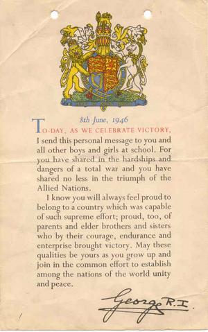 The attached letter, sent to schoolchildren from the King, is a reminder of those days and the vivid recollections that still remain.