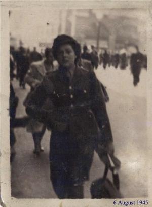 leave in London when a street photographer snapped me just after I bought a newspaper headlining the explosion of the first atomic bomb on Hiroshima (see attached photo). That I think was on 6th August and I can recall nothing of the following days. Sadly there are no documents surviving to remind me of what I did or thought so I can only speculate and there is no place for that in a document such as this.