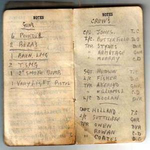 Copy of my Grandads personal notes, showing the list of 1st Troop Crew names, including his CO Captain Holland.