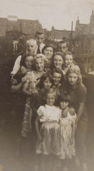 In this picture Irene and her family are in their back garden at Cresset Road. Irene is the girl on the right - holding her finger to her mouth