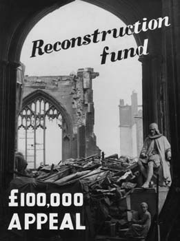 The Reconstruction Fund appeal poster, showing the damaged Regiment Chapel of Manchester Cathedral