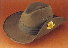 The history of the Australian slouch hat can be traced back for more than 100 years to colonial times. Like the pioneering squatters who adopted wide brimmed felt hats as protection from the harsh summer sun, several of Australia's colonial armies selected slouch hat for the same practical reason. The New South Wales Lancers, the New South Wales Mounted Rifles and the Victorian Mounted Rifles wore the slouch hat in the early 1880's. It was usually worn with the brim turned down all round and gave the wearer a somewhat fearsome appearance, particularly if he sported a large droopy moustache so typical of the times.