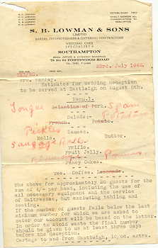 This is a copy of Joan's wedding menu. There were many changes to the menu due to rationing. Note the change of pork to spam/tongue and prunes and blaumange instead of trifle and jelly. Also lemonade had been crossed off.