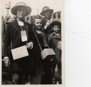 Audrey and Betty Thurlow as evacuees. They have name labels around their necks, and the boxes hold their gas masks.