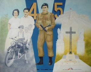 To his right are images of his life before and after the war, to his left are images of the ruins of the Abbey at Cassino and the monument of the 5th Division at Cassino between the two eagles each side of the gate into the Polish cemetery at Monte Cassino.