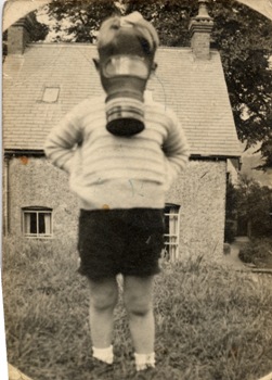 Alan Bateman wearing his gas mask. Taken around 1940.