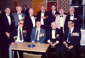 With many of my old shipmates from "Electra" I attended the HMS Hood Association 10th Reunion Dinner, held in the Victory Club, HMS Nelson, Saturday, 24th May, 1986. Back row L to R: Jack Taylor, Bill Brealey, Tom Shiersmith, Bob Tilburn (Hood survivor), Eddie Skerrit, Cyril Madell, Phil Perkins. Front row L to R: Charlie Mantle, Bert Allen, Jim Preet, Ted Briggs (Hood survivor)."