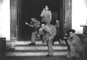 Calcutta, 1944. Me (extreme right) on the steps of one of the the palatial homes of the poet Rabindranath Tagore - opened to the RAF for the duration of the war. Here, I and my friends do a silly burlesque on the steps of the grand entrance.