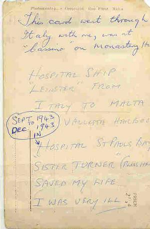 I had developed malaria. But what was worse, I had also contracted pneumonia. I became very ill and delirious. In October I was whisked away to a hospital ship called the ‘Leinster’, and stretchered off at Valetta in Malta. The harbour looked like a stunted forest, with the funnels and masts of sunken shipping sticking out of the sea. A pilot came aboard to negotiate the ship through the wreckage, so that a landing could be affected. From there an ambulance took me to the hospital, sited on a hill at St Paul’s Bay. I had an abscess on my lungs, as well as the malaria. I almost became a permanent resident of that island; I had not been expected to last till morning. I fortunately survived a temperature of 107 degrees. Sister Turner- how could I ever forget her? - sat by my bed through that night when I was critically ill and held my hand. I believe she was my guardian angel- she played no small part in my survival. I had weighed eleven and half stone; I came out of the hospital weighing nine stone.