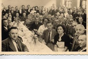 Firth-Derihon, large office, showing guests who were escapees from Belguim, 22nd July, 1942. Betty is on the back row holding a doll aloft.