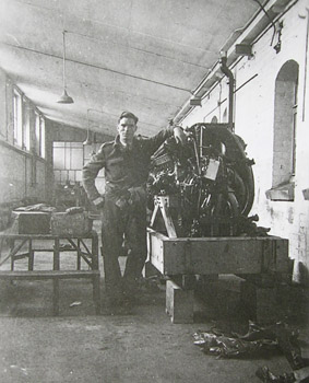 Jack Woodhouse with an aeroplane engine that he was working on.