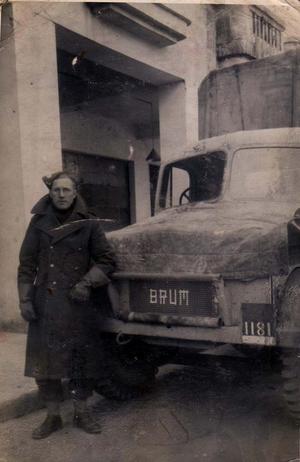 The Photograph shows him beside a lorry, as he was a driver during that time. He would have put ‘BRUM’ on the front radiator to represent his home town of Birmingham. The caption on the back of the photograph says “Blimey it aint arf bloody cold. I have just had a cup of tea and cakes in the café on the left.”
