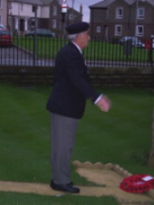 Remembrance Sunday, November 2004. Pat Kelly, one of five siblings who served in the Armed Forces during World War Two lays a poppy wreath and salutes to remember fallen comrades at the World War Two Memorial, St Begh's Church, Coach Road, Whitehaven, Cumbria.