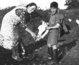 Ron Hicks helping the farmers wife to feed the chickens on the farm where he was hosted as an evacuee in 1941.