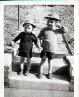 Photograph shows Frank Theaker (left) and his older brother George wearing Home Guard Helmets in the back garden of their home at 17 Daresbury Road, Sheffield in 1942.