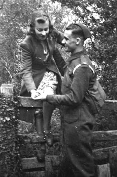 Doris is helped over a style by her fiance, Len (Royal Artillery) 1942, Meldreth in Cambridgeshire