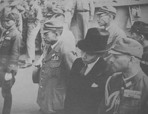 Here we see the Japanese High Command led by General Umzu setting off to board the Missouri in Tokyo Bay to sign the surrender terms for the end of the War in the Far East.Bill Morley's Ship HMS 'Duke of York' formed an escort.General Mc Arthur signed for the USA and General Faber signed for Great Britain and the Crown.There was also representatives from France,Belgium,Australia,New Zealand and many more Countries who all signed on behalf of their Country.