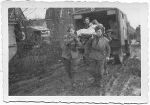 When I left the company after the war in Europe had finished one of the lads said that someone had taken some photos of the company’s travels and if I would like to purchase some they would send them to me, so I gave them my home address in England, and when I was demobbed about twelve months later my family had kept them for me. This is one of them the lads working with the ambulance, I think it was in the Reichwald forest area