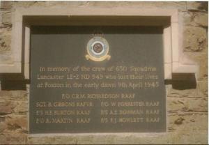 We were awakened by the sound of a Lancaster Bomber — obviously in trouble, we arose, put on the light, forgetting the “Blackout”, rushed to the door of the hut to see the Lancaster heading straight for the hut — We all were petrified and not one of us could move to try to save ourselves. The nose of the Lancaster rose slightly and it crashed in a field near Foxton, just a few hundred yards away from our hut. Sadly all the crew were killed.