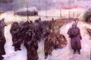 The picture below illustrates POW's being marched from East Prussia to Germany in 1945. It is from an oli painting by Mr Stan Johnson of Blyth, Northumberland who was on the march. Mr Johnson has sadly passed away recently.